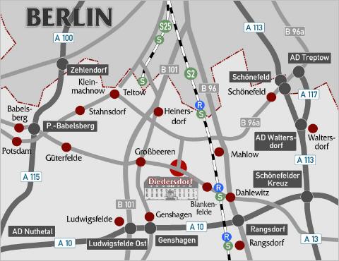 Über die Autobahn erreichen Sie uns am besten über die A10 "Südlicher Berliner Ring". An der Anschlußstelle Ludwigsfelde-Ost (Ausfahrt N° 14) wechseln Sie auf die neue B101( Fahrtrichtung Teltow/Großbeeren/Berlin. Schloss Diedersdorf ist dann bereits gut sichtbar an der B101 ausgeschildert. Sie werden dann über Großbeeren direkt bis Diedersdorf geleitet.